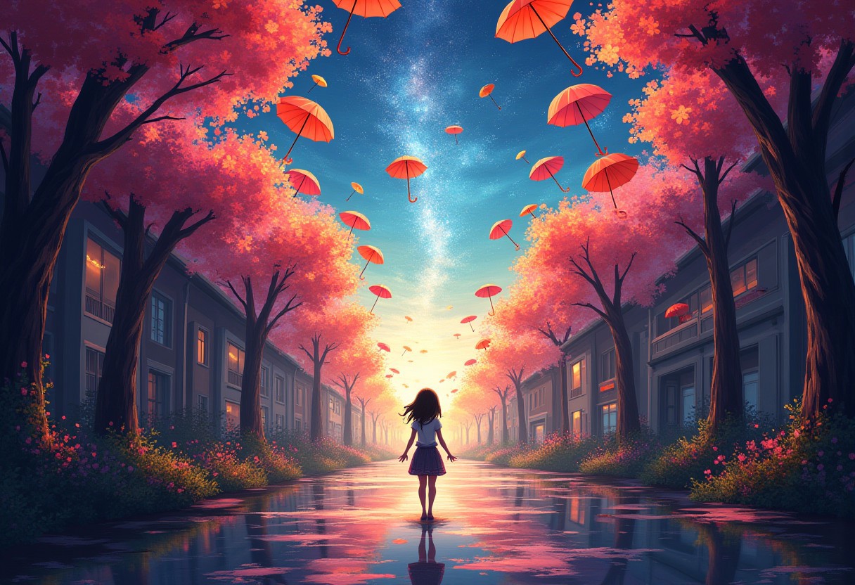 aidmaMJ6.1, In a vibrant town where umbrellas bloom like flowers in the sky, a young artist named Lila discovers a hidden gallery made of shimmering light. Each painting inside reveals a different version of her life—some joyous, others painful. Drawn in by the colors and the tales they tell, Lila spends days lost in their beauty, until one day, she notices a blank canvas among the masterpieces. As she touches the canvas, it begins to pulse with energy, revealing her deepest fears. Realizing that she must confront them to move forward, Lila steps back. But with each brush stroke of courage, the paintings around her begin to fade, threatening the very essence of their stories. With time running out, Lila must decide whether to complete her own tale by embracing the unknown or preserve the lives of the vivid characters she’s come to love. In a surprising twist, her choice alters the fabric of reality, intertwining her life with the paintings. Now, Lila must navigate this colorful world, where dreams meet reality, and every choice can paint a new destiny.