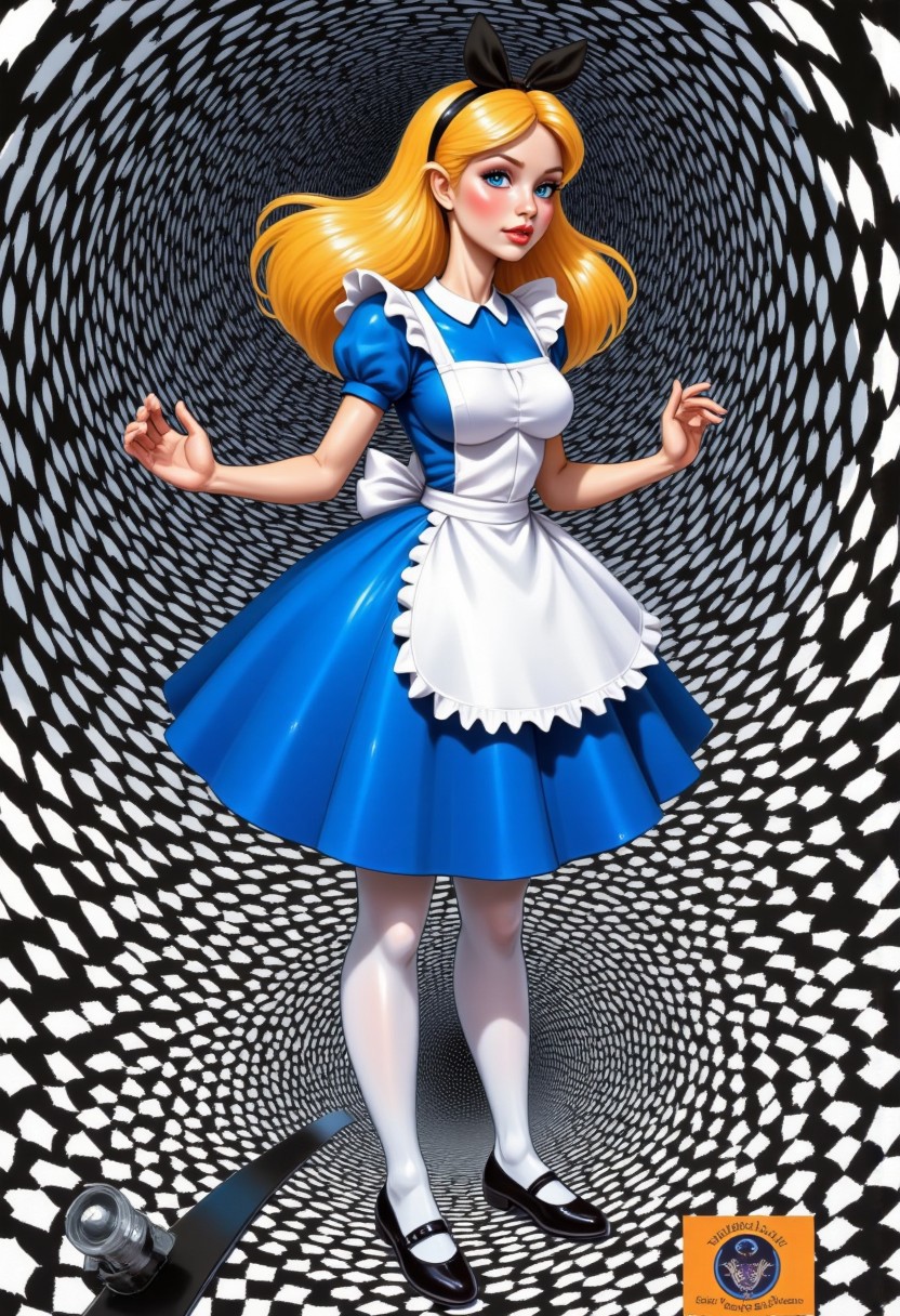 faded |damaged |poor condition |3::}Book cover: "Alice in the Multiverse", subtitle: "Topsy Turvey", author: "KaosEngine". A woman falling into a black-and-white spiral AliceWaifu, blue eyes, blue dress, white pantyhose, apron, black bow, blonde
