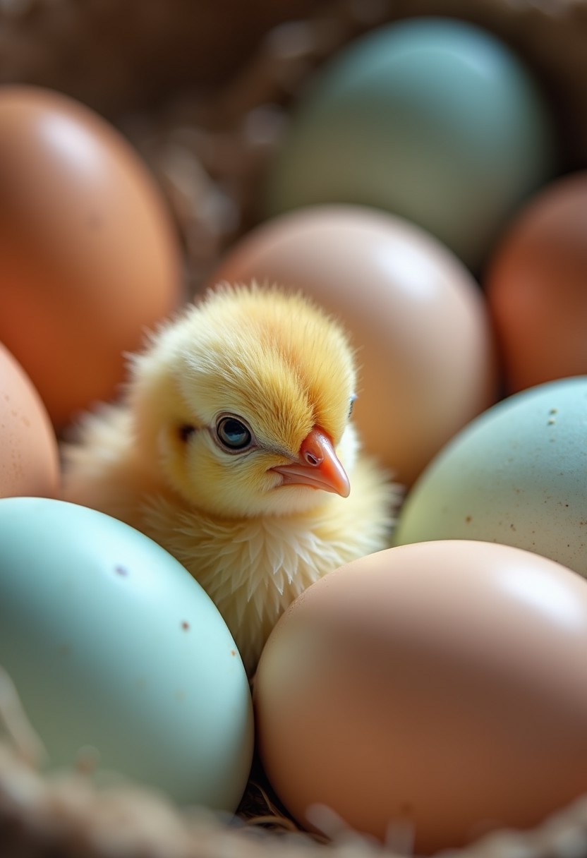 A small, fluffy chick nestled among (several eggs), its (delicate beak and soft feathers) barely visible between the [different-colored eggshells]. The chick’s eyes are wide and curious, adding to its (innocent and fragile appearance). The scene is [soft and natural], with muted tones that emphasize the (new life emerging) in a moment of (quiet beauty and purity).