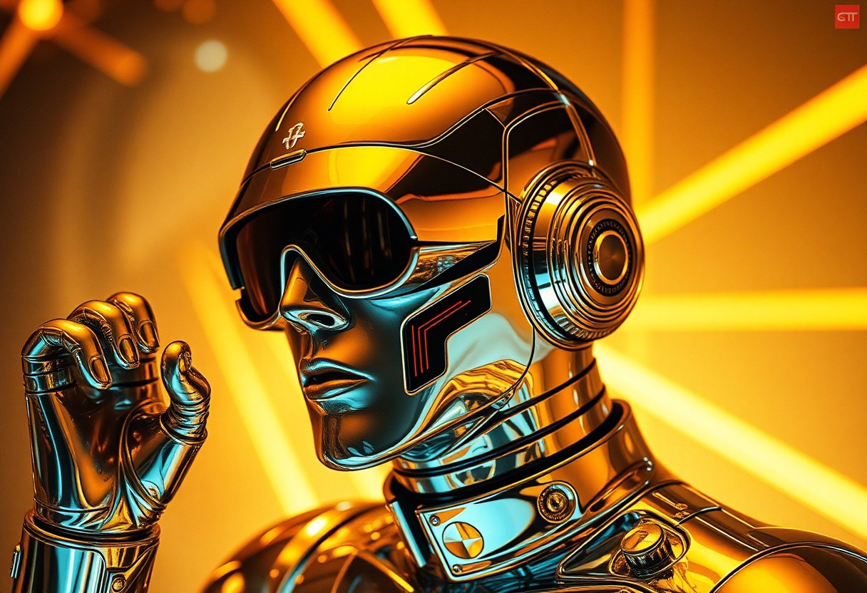 Avant-garde , Robert T techno style ,1970s retro futurism , chrome and Gold