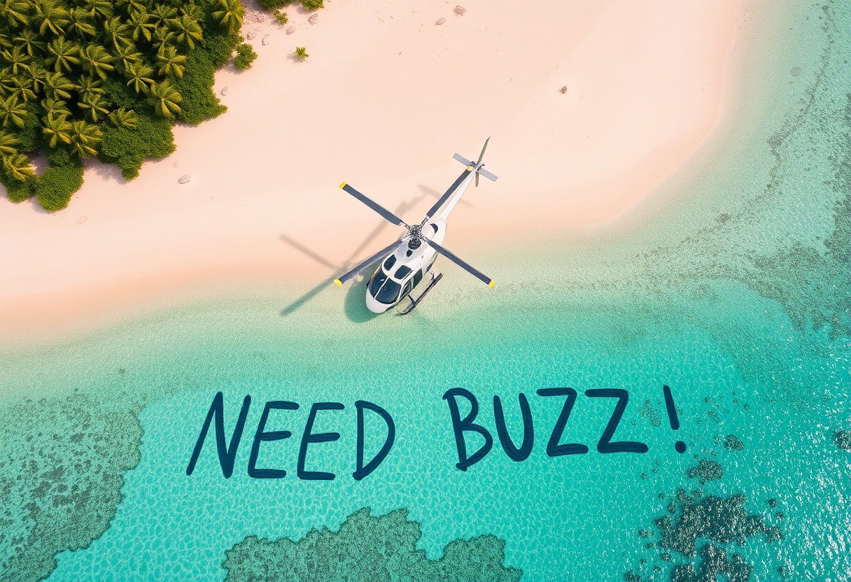 Helicopter aerial view of tropical desert island beach where there is written text by a survivor "NEED BUZZ"