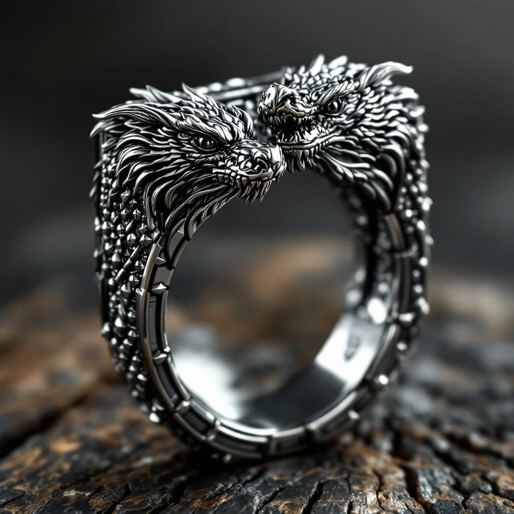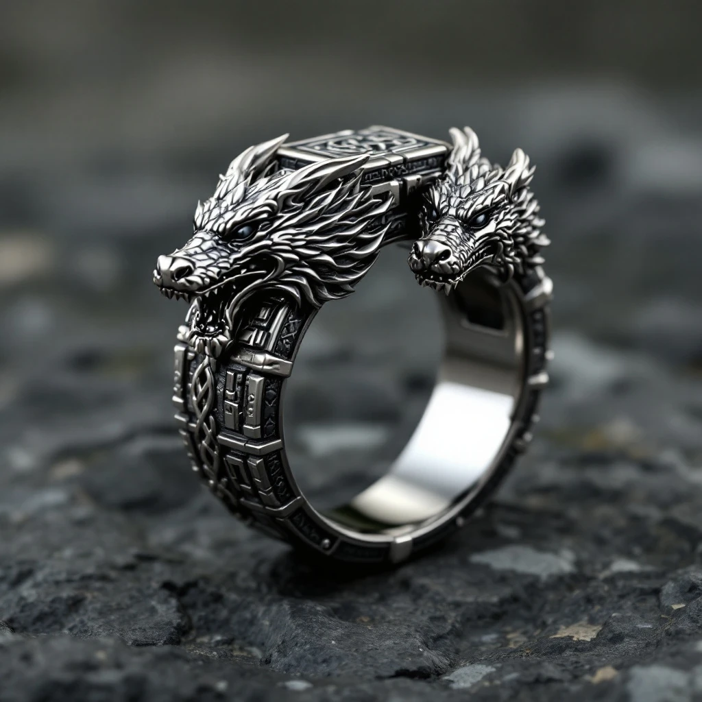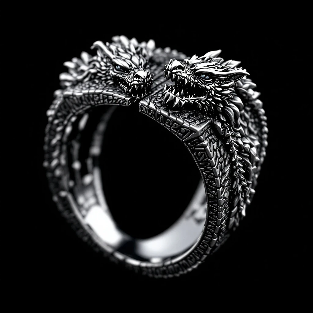 Design a ring inspired by viking drakkar with two intricately detailed dragon heads on each side of the ring, fierce and majestic expressions and a wooden sculptural texture. the ring should have a square profile with gently curved recessed sections on each side for adjacent fingers to rest comfortably, the band should mimic the sleek shape of a drakkar with detailed engravings along the sides to represent the ship's planks and rivets, incorporate lots of complex over-and-under sculptural work inspired by Michael Vicente's "Orb" on ArtStation and Viking knotwork, add elements inspired by drakkar tattoos throughout the design for additional visual interest, include Norse runes and Viking art patterns along the top and bottom edges of the band. The overall design has flat hard surface planes providing elegant reflections and recessed panels with sharp well defined edges. The ring is made of 14k white gold with black rhodium plating to highlight the dragon heads and engravings, adding small black diamonds as eyes for the dragon heads to enhance the overall aesthetic and mystery of the piece. The ring sits on a relevant background with a tattered viiking-era map, heavily textured with a vibrant linen texture sitting under the ring and ocean wave inspired elements around it to complement the theme