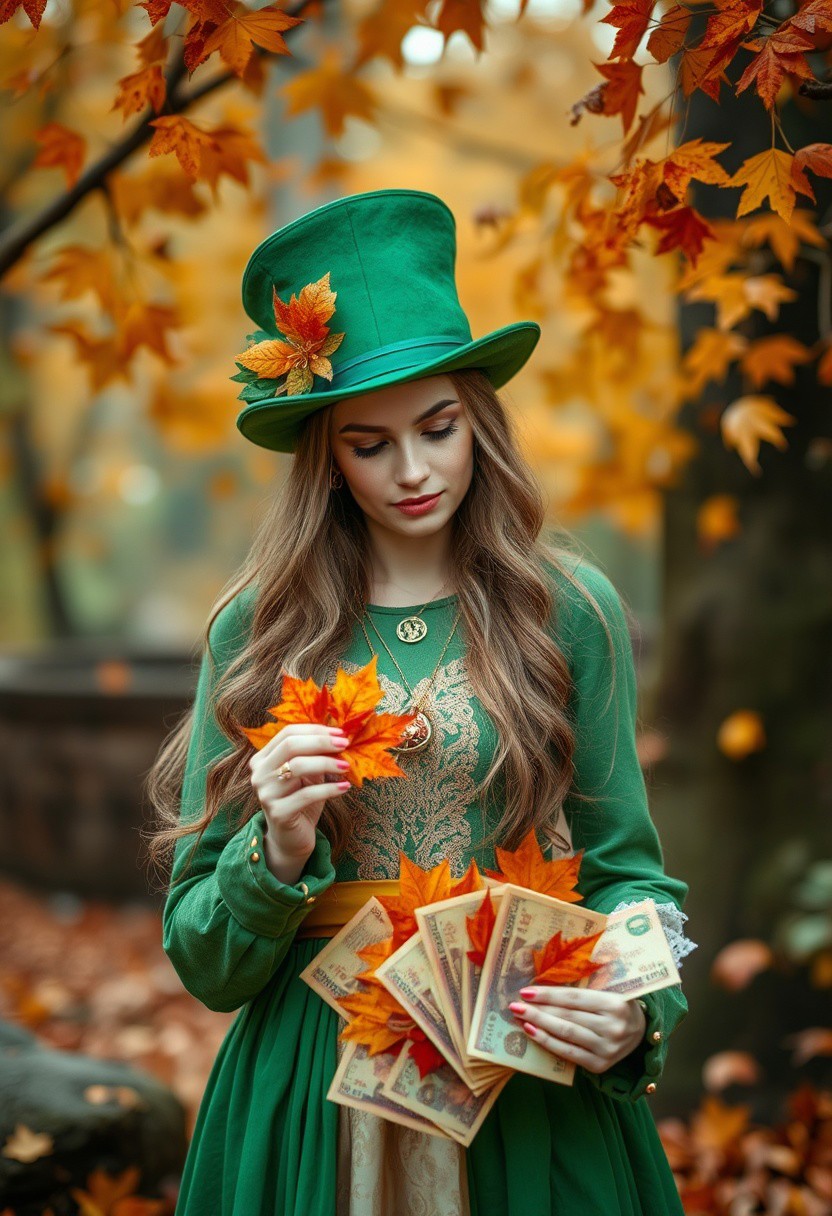 reality-shot, realism, realistic photography of a beautiful feminine leprechaun in an magical wonderland, magically changing autumn leaves into Orange and yellow bank notes,