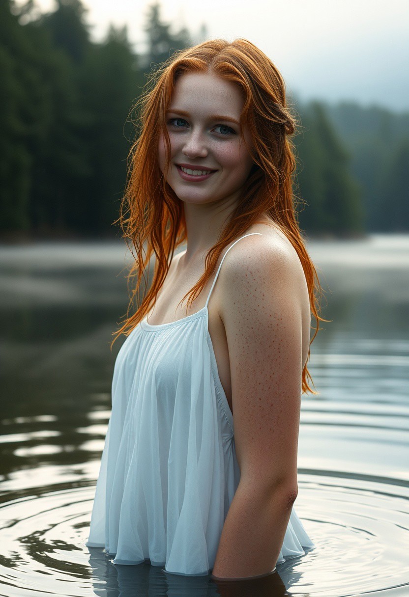 A photorealistic masterpiece of a 21 year old Scottish woman. She is standing up to her knees in a shallow loch. Her ginger hair is soaking wet and she has pale skin, freckles and a cute round perfect face. She is wearing a wet long white gown Dawn light can be seen creeping through the trees at the back and the early morning mist sits on top of the water. She is smiling giving off an ethereal vibe.
