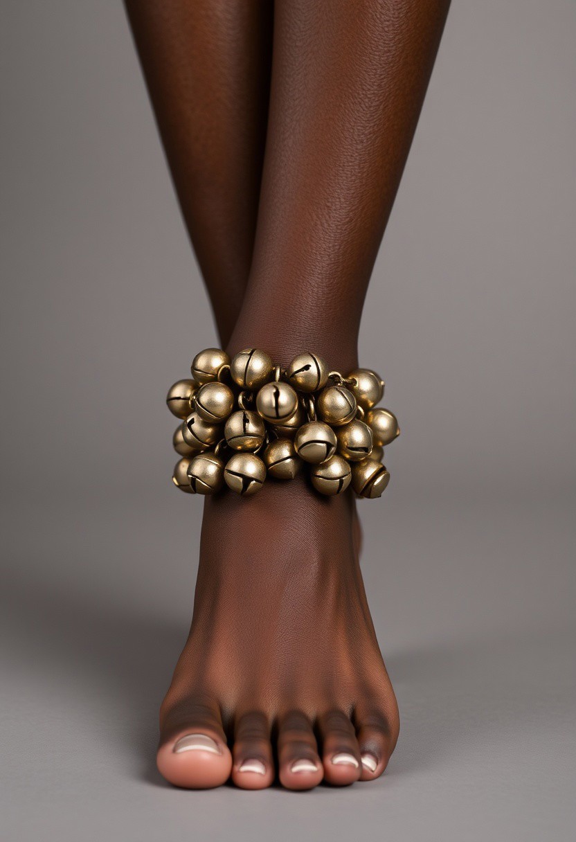 front view of an african female ankle, bracelet full of large size bells, neutral grey background, photography studio style