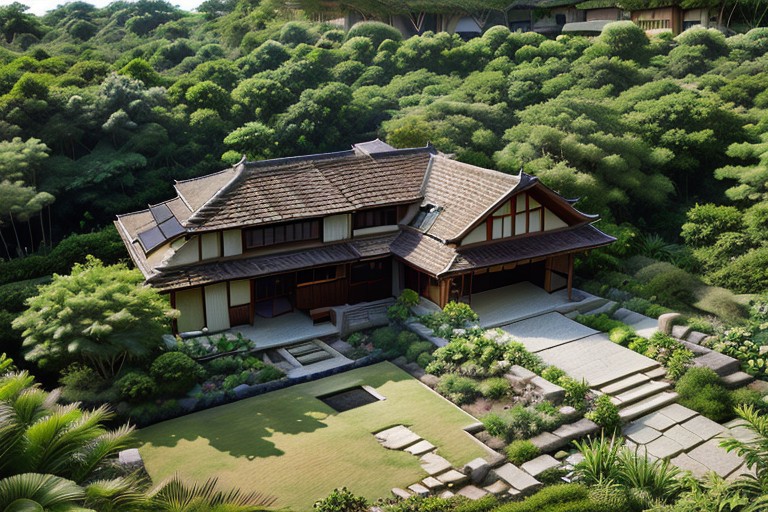 A serene Wabi-Sabi tropical garden house, blending timeless minimalism with earthy tones, raw natural textures, and a peaceful simplicity. The house design emphasizes harmonious asymmetry and soft natural light, seamlessly integrating with lush, tropical gardens that enhance the tranquil atmosphere. Use curated antiquities and subtle architectural restoration to bring a sense of history and imperfection into the modern design, creating a balance between historical modernity and minimalism. The structure should celebrate organic imperfections while staying true to the beauty of impermanence, surrounded by vibrant yet understated tropical foliage. Top view of the house and surrounding garden, capturing the seamless connection between architecture and nature. Focus on ultra-realistic rendering, with a 32k resolution, featuring high-quality textures, realistic lighting, and detailed backgrounds. The scene should combine Wabi-Sabi’s beauty in simplicity with tropical vibrance, resulting in a tranquil, aesthetically harmonious environment. --ar 15:9, (Ultra Realistic:1.0), (Masterpiece:1.0), (High Quality:1.0), (Detailed Realistic Background:1.3), (Official Art, Beautiful and Aesthetic:1.2), (Realistic Lighting:1.0)
