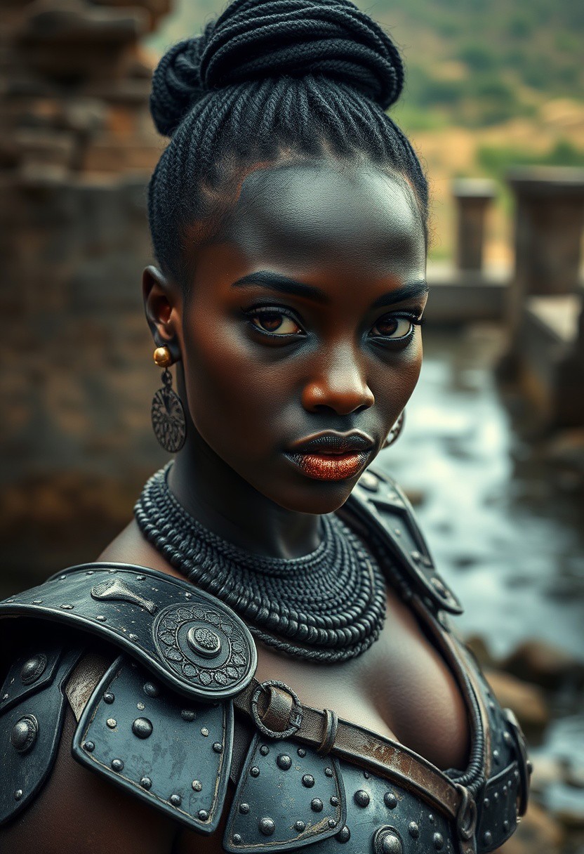Stable_Yogis_PDXL_Positives medium shot of a sexy beautiful african female warrior, Glitter cut crease with bold lips makeup style , bun hairstyle , black coal hair_color , bones ear climbers , wearing iron armour, ancient ruins on the edge of a river , shot with Canon PowerShot G7 X Mark III Compact camera, light_particles, cinematic, dynamic_angle, depth_of_field, bokeh, HDR, 8K, RAW, best_quality, top_quality, hyperrealistic, photorealistic, ultra_detail, ultra_realistic, masterpiece, hi-res, absurd_res, high_quality_photography, source_photo, highly_detailed, very_aesthetic, beautiful, realistic, real_life.