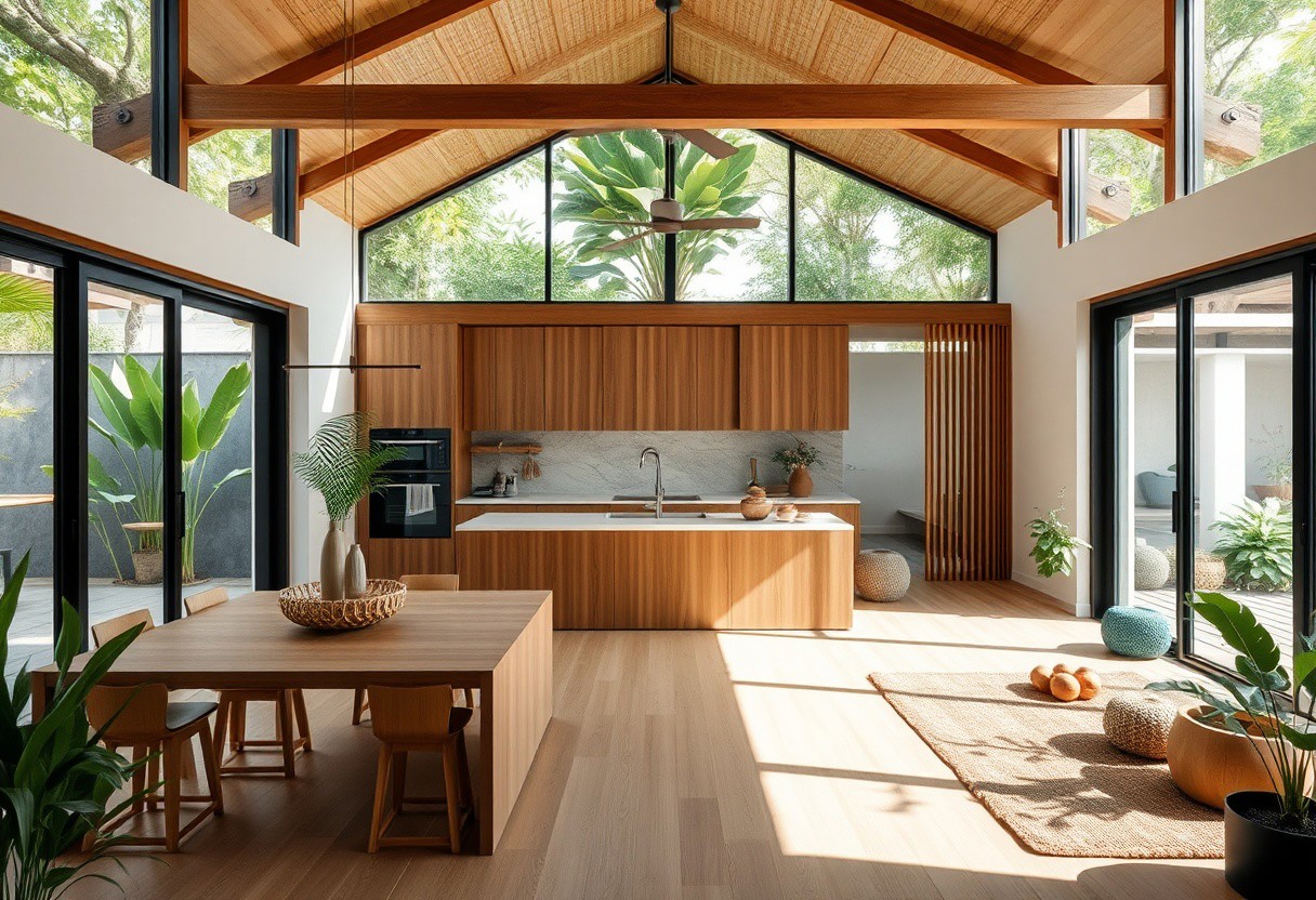 A Zen-inspired kitchen and living room interior featuring tropical modernism, with an open floor plan that embraces natural ventilation and a minimalist aesthetic. The studio combines local materials such as bamboo, stone, and tropical wood to create a harmonious connection with the environment. Apply 60-30-10 rule: 60% primary color as light wood and earthy tone, 30% secondary color as soft green, 10% decoration color as navy blue, terracotta. Emphasize a seamless fusion of indoor and outdoor spaces through large sliding doors, open-air patios, and expansive windows that blur the line between the interior and nature. The design features semi-enclosed spaces that provide a calm and contemplative atmosphere, perfect for meditation or relaxation, while maintaining a sense of openness and flow. Natural light floods the space, highlighting the earthy tones and textures of the materials, while the gentle breeze from outdoor ventilation cools the room. The minimalist composition focuses on simplicity and function, with clean lines and uncluttered spaces that promote tranquility and balance. The overall design blends the serenity of Zen philosophy with the natural vibrancy of tropical modernism, creating a peaceful yet vibrant studio where the indoor environment feels seamlessly connected to the lush outdoors.
