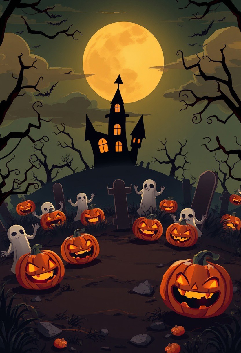 halloween theme, spooky graveyard with pumpkin ghosts creatures and orange sky, higlights are brown and black colors, cartoon style, mobile wallpaper, hyper realistic, ultra detailed
