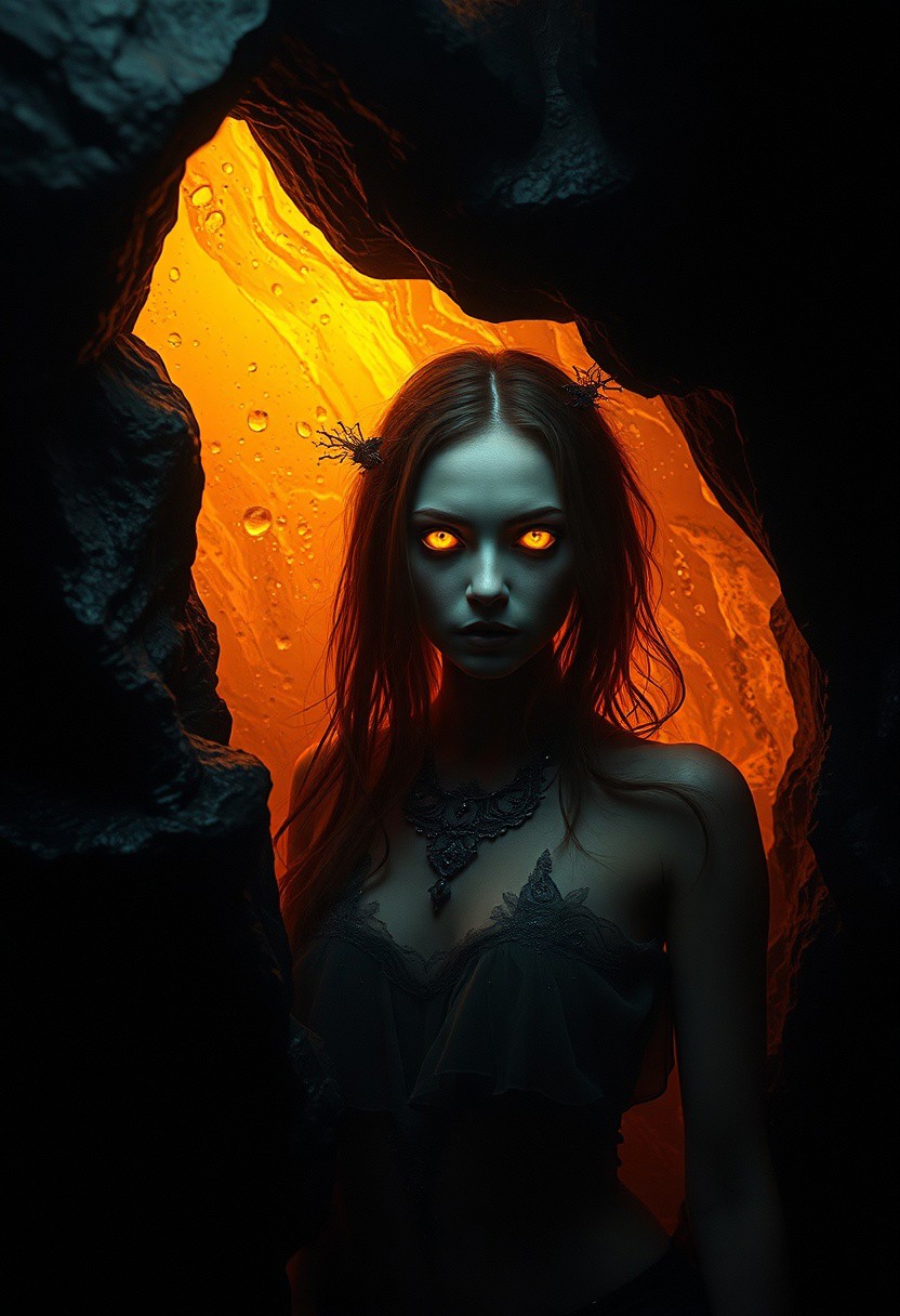 In the depths of the amber,a dark and mysterious world unfolds,where a surreal death woman with eyes of liquid gold wanders,lost in the amber's enigmatic dreamscape surrealistic,