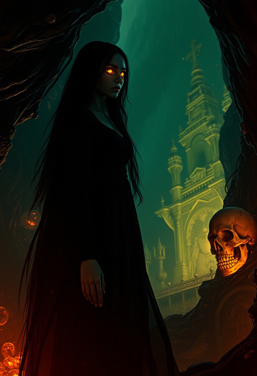 In the depths of the amber,a dark and mysterious world unfolds,where a surreal death woman with eyes of liquid gold wanders,lost in the amber's enigmatic dreamscape surrealistic,
