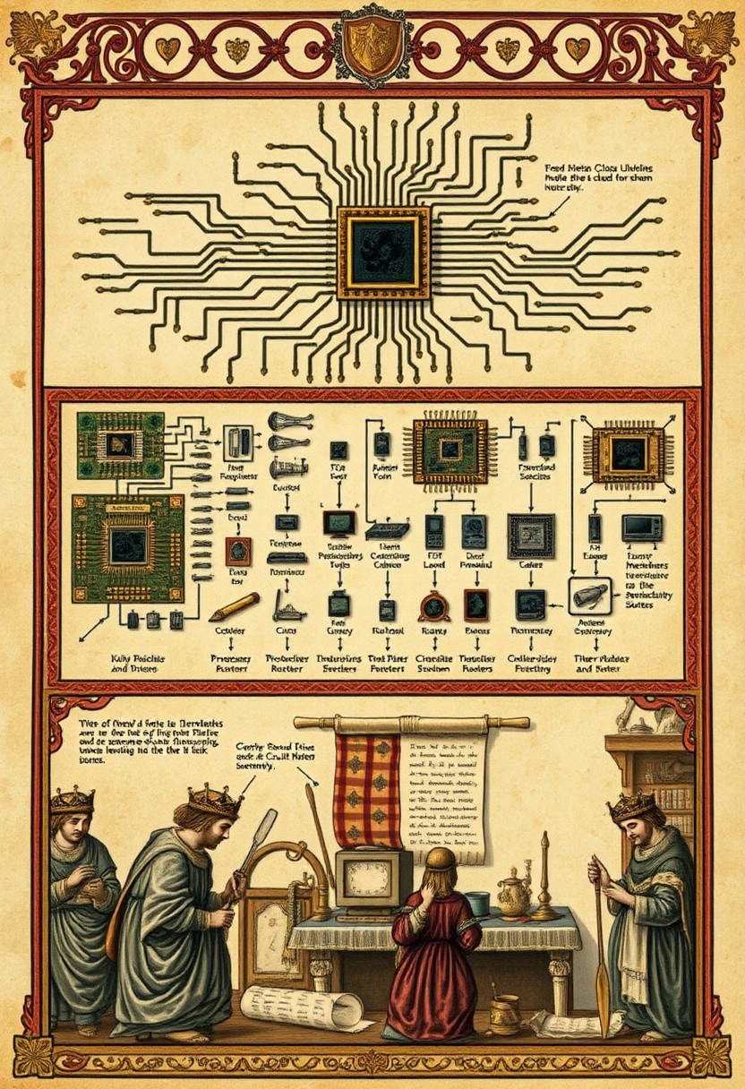 Historical Scene, Medieval Art Style, Detailed Sectioned Illustration of the Manufacture of Microchips in the Middle Ages, Depicting Innovations, Transistors, and Circuit Boards, with Ornate Decorative Background. The upper section showcases the intricate process of creating microchips, with decorated circuit pathways and delicate transistors highlighted as symbols of medieval craftsmanship. The middle section presents medieval computer devices such as processors, motherboards, and routers, with small icons depicting the importance of semiconductor technology. The lower section illustrates chip design and assembly, with artisans working in a medieval-style workshop surrounded by ornate tools and scrolls of code.