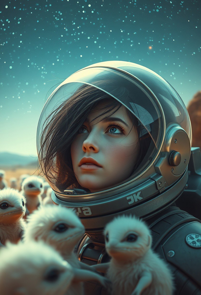 Amidst an alien landscape, a young woman in a transparent-visored space helmet gazes at the horizon, her dark hair tousled. Soft, fluffy alien creatures surround her, their innocence contrasting with the hard lines of her futuristic gear, under a celestial sky teeming with stars.