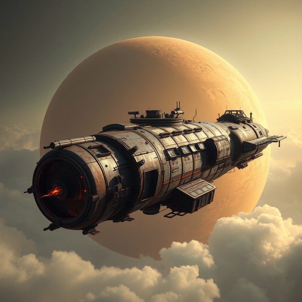 A large, aged, rusty spaceship with a round engine flies through a cloudy sky against a backdrop of a large, orange planet. The spaceship is a complex design, with many windows, hatches, and panels. The engine is lit with flames. The ship's surface has ma
