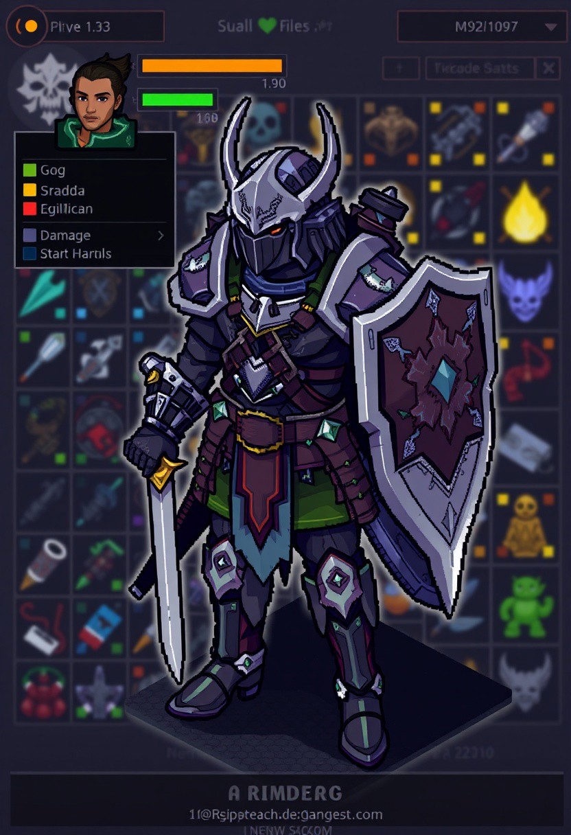 (8-bit pixel art character:1.5), (gothic fantasy warrior:1.3), modular design, (equipment slots:1.4), (helmet, chest armor, gloves, boots, sword, shield:1.2), inventory system, (blocky pixel sprites:1.3), (drag-and-drop equipment mechanics), (color-coded item rarities), (limited color palette:1.2), (simple shading), (action pose:1.1), (inventory grid background:1.2), glowing highlights for equipped items, (damage stats UI overlay:1.1), (arcade-style text), (isometric character portrait:1.2), dark RPG theme, (pixel lighting effects:1.1), (blurry:-1.2), (photorealism:-1.5), (smooth textures:-1.2), (high resolution details:-1.4), (overly bright colors:-1.2)