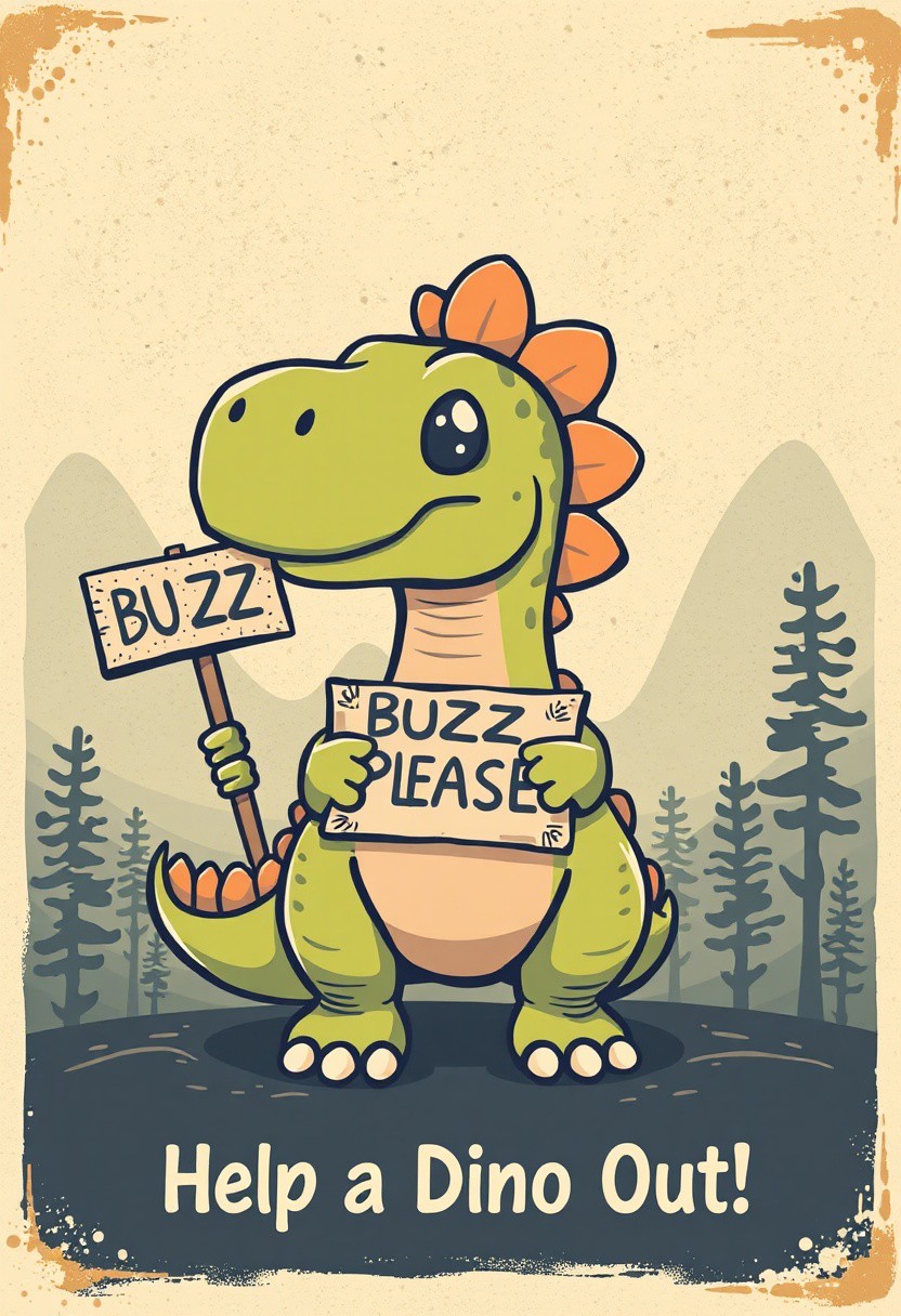 Vintage retro cartoon poster design, A cute dinosaur holding a tiny sign: “BUZZ PLEASE”, the poster text says: “Help a Dino Out!”