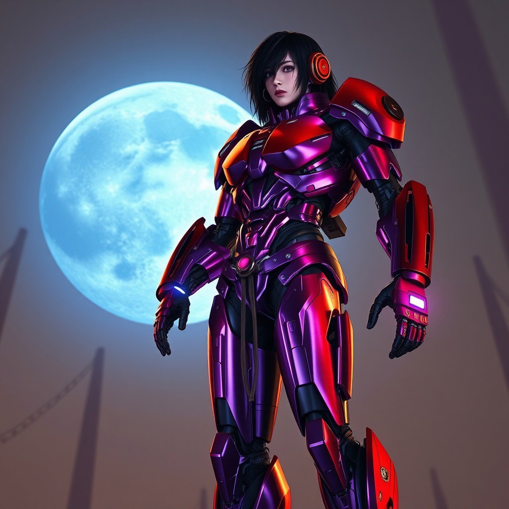 A full-body cyberpunk cyborg with a shiny purple and red titanium body, storing weapons inside. Dark hair, tied at the waist, hair over one eye. The cyborg stands on a tall tower with a giant blue moon in the sky. Blue light on the wrist, pink light on the chest. Reflective lighting, high-detail, 3D mecha effect, with textured skin and perfect proportions.
