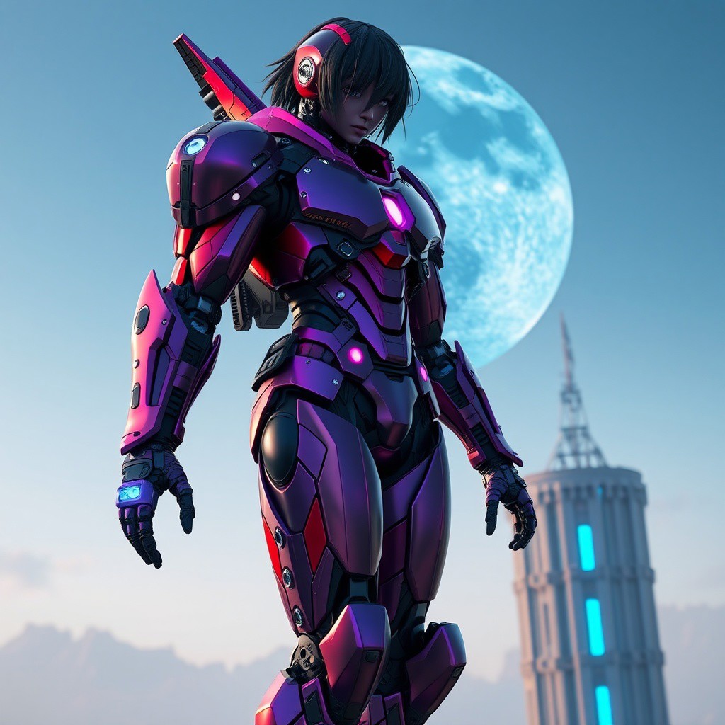 A full-body cyberpunk cyborg with a shiny purple and red titanium body, storing weapons inside. Dark hair, tied at the waist, hair over one eye. The cyborg stands on a tall tower with a giant blue moon in the sky. Blue light on the wrist, pink light on the chest. Reflective lighting, high-detail, 3D mecha effect, with textured skin and perfect proportions.