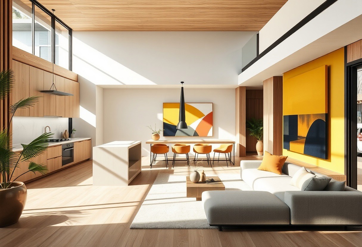 A serene Japandi kitchen and living room interior view, combining tropical elements with modern art movements such as post-painterly abstraction, hard-edge painting, and geometric abstraction. The design emphasizes structural clarity and dynamic composition, blending sculptural forms and geometric accents with a minimalist approach. Clean lines and open spaces enhance the calm atmosphere, while non-representational art introduces a sense of movement and depth. Apply 60-30-10 rule: 60% primary color as light wood and earthy tone, 30% secondary color as light grey, 10% decoration color as mustard yellow, navy blue. The interior integrates natural materials like wood, bamboo, metal, fire, earth, and water. These materials are complemented by bold color fields and sharp-edged geometric forms that reflect the modern art influences. Calligraphy serves as a cultural touchpoint, subtly blending with the non-representational art to maintain the balance between tradition and modernity. Sculptural forms are used to create focal points in the space, drawing attention to the dynamic contrasts between sharp geometric lines and organic materials. Natural light plays a crucial role, casting shadows across the minimalist interior and enhancing the interplay between solid, abstract forms and soft natural textures. The overall design balances simplicity with artistic expression, resulting in a tranquil yet visually stimulating duplex interior that merges tradition with modern art.