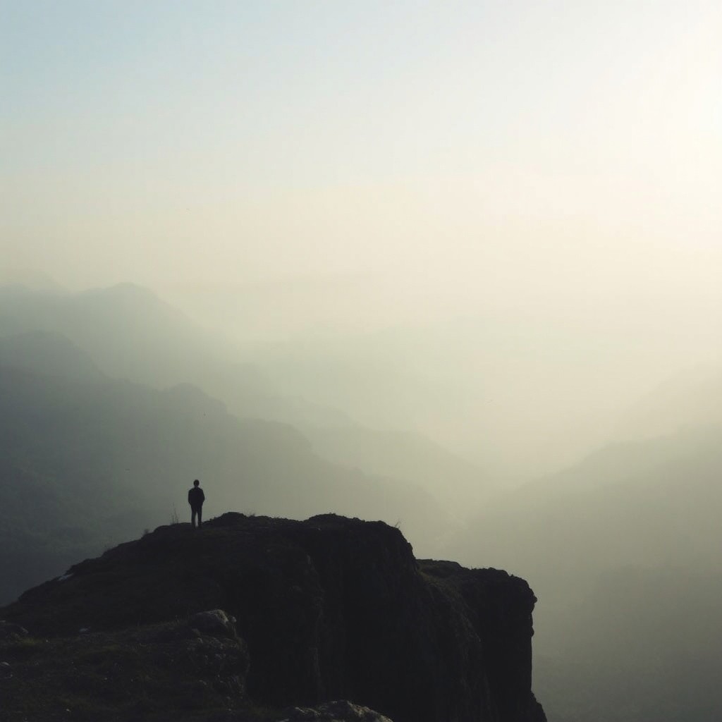 A vast, misty landscape at dawn, with mountains fading into the distance, symbolizing the expansive, emotive quality of post-rock music, with soft, ethereal lighting and a lone figure standing on a cliff, contemplating the view, dreamlike atmosphere, muted colors.