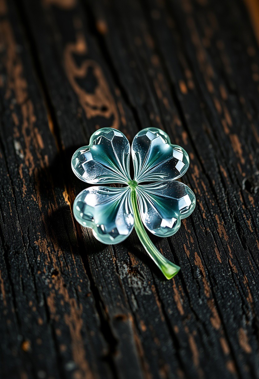 highly detailed crystal transparent 4 leaf clover (with fine textures) on a weathered, textured black wooden surface, vibrant contrast between the (transparent 4 leaf clover) and the (faded, peeling wood), depth and shadow enhanced using (Gaussian blur) for a soft background focus, (sharpen filter) applied to the transparent 4 leaf clover, (color grading) to enhance contrast between warm and cool tones, (lens flare) subtly added to create natural lighting effect, (noise reduction) for a smooth, clean finish, (HDR toning) used for extra depth and detail, emphasizing the intricate patterns in both the transparent 4 leaf clover and wood grain