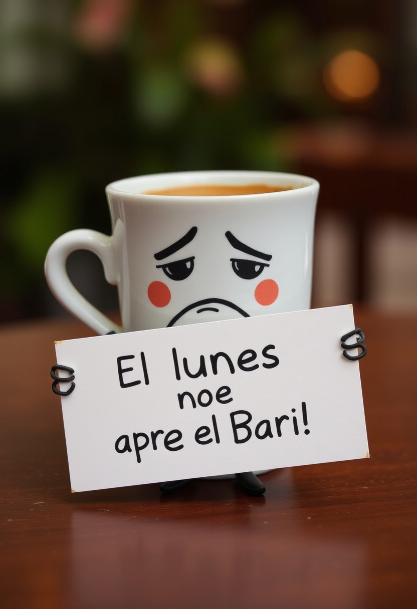 A coffee cup with a face, looking tired, holding a sign: “El lunes no abre el Bari!”
