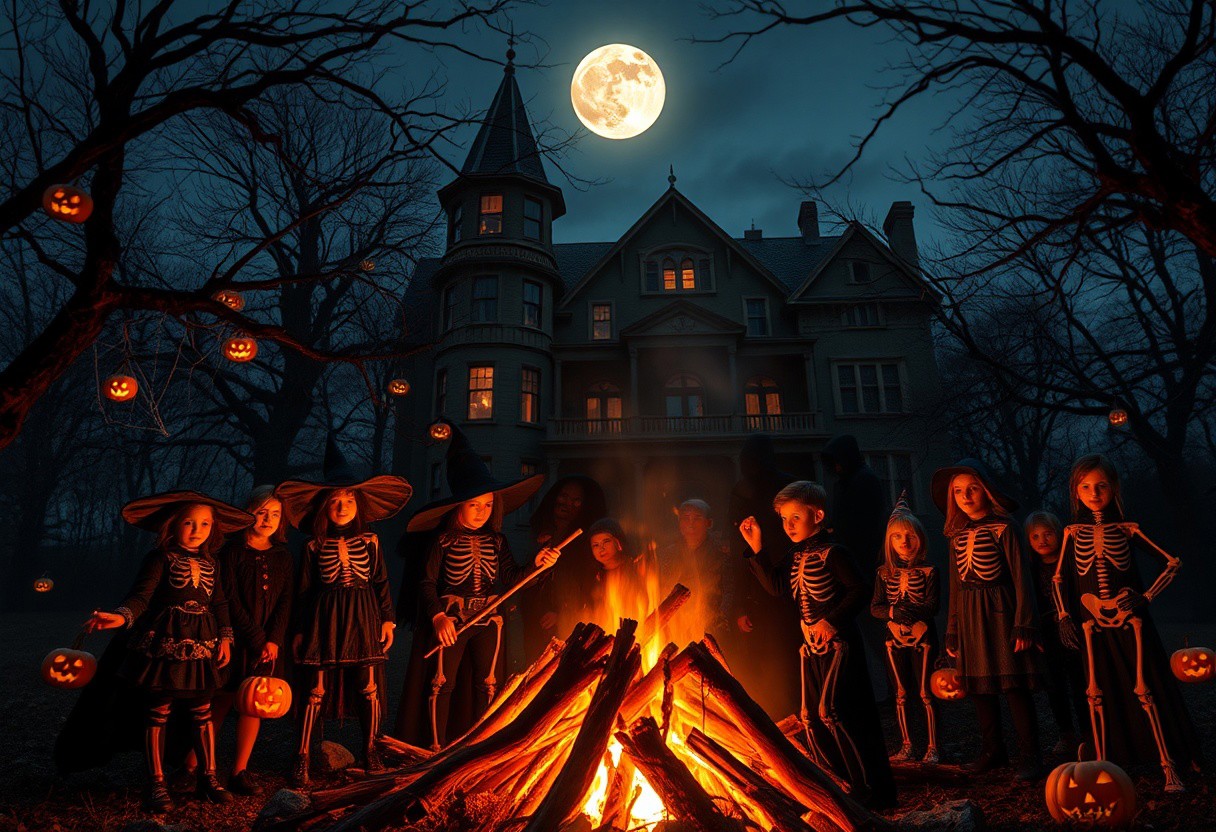 A cinematic Halloween scene for 2024, captured with stunning depth using Panavision Prime lenses. The title, ‘How to Enjoy Halloween 2024,’ curves at the top in a spooky, chilling font. Set at dusk beneath a full moon, the scene features a decaying Victorian mansion with cobwebs stretching across twisted trees and flickering jack-o’-lanterns that seem to glow with a supernatural light. Dramatic lighting adds rich contrasts, with shadows from the moon and bonfire creating a perfect blend of warmth and eerie coldness. Children and adults in hyper-realistic costumes—witches with eerie features, hollow-eyed skeletons, and iconic horror figures—gather around a large bonfire. Their detailed costumes and subtle facial expressions are brought to life through the sharp, cinematic quality of the Panavision lenses, which capture every nuance. The bonfire’s flickering light reflects in their eyes, while darkened figures in the background linger mysteriously, hinting at something unseen. The gothic mansion looms ominously, its windows barely visible through the mist, and the surrounding cemetery holds crumbling tombstones and creeping shadows. Bats flutter across the night sky, casting fleeting shadows. Every detail, from the texture of the mansion to the shimmering cobwebs, is highlighted by the precise focus, making this Halloween scene both visually stunning and deeply unsettling.