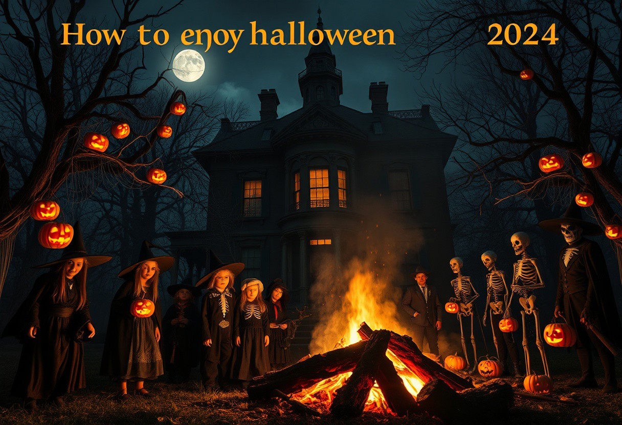 A cinematic Halloween scene for 2024, captured with stunning depth using Panavision Prime lenses. The title, ‘How to Enjoy Halloween 2024,’ curves at the top in a spooky, chilling font. Set at dusk beneath a full moon, the scene features a decaying Victorian mansion with cobwebs stretching across twisted trees and flickering jack-o’-lanterns that seem to glow with a supernatural light. Dramatic lighting adds rich contrasts, with shadows from the moon and bonfire creating a perfect blend of warmth and eerie coldness. Children and adults in hyper-realistic costumes—witches with eerie features, hollow-eyed skeletons, and iconic horror figures—gather around a large bonfire. Their detailed costumes and subtle facial expressions are brought to life through the sharp, cinematic quality of the Panavision lenses, which capture every nuance. The bonfire’s flickering light reflects in their eyes, while darkened figures in the background linger mysteriously, hinting at something unseen. The gothic mansion looms ominously, its windows barely visible through the mist, and the surrounding cemetery holds crumbling tombstones and creeping shadows. Bats flutter across the night sky, casting fleeting shadows. Every detail, from the texture of the mansion to the shimmering cobwebs, is highlighted by the precise focus, making this Halloween scene both visually stunning and deeply unsettling.