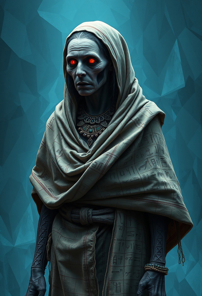 An ancient woman discovers an antique, cursed necklace at a flea market and wears it, triggering a transformation. As the necklace's curse takes hold, her body begins to morph into a terrifying yet mesmerizing creature, with scales, fangs, and glowing red eyes. Cloaked in tattered fabric adorned with intricate hieroglyphs, her once-human form is now wrapped in history. The cloth is worn and dusty, with cobwebbed strands catching the light, symbolizing her age and the curse’s power. She stands against an abstract, polygonal background of icy blues that shifts from light to dark, evoking the cold detachment of a frozen digital void. Every wrinkle, stitch, and hieroglyph tells a story etched in the fabric, blending themes of ancient curses and futuristic decay, as she exists between worlds—one of antiquity and another, a crystalline digital landscape.