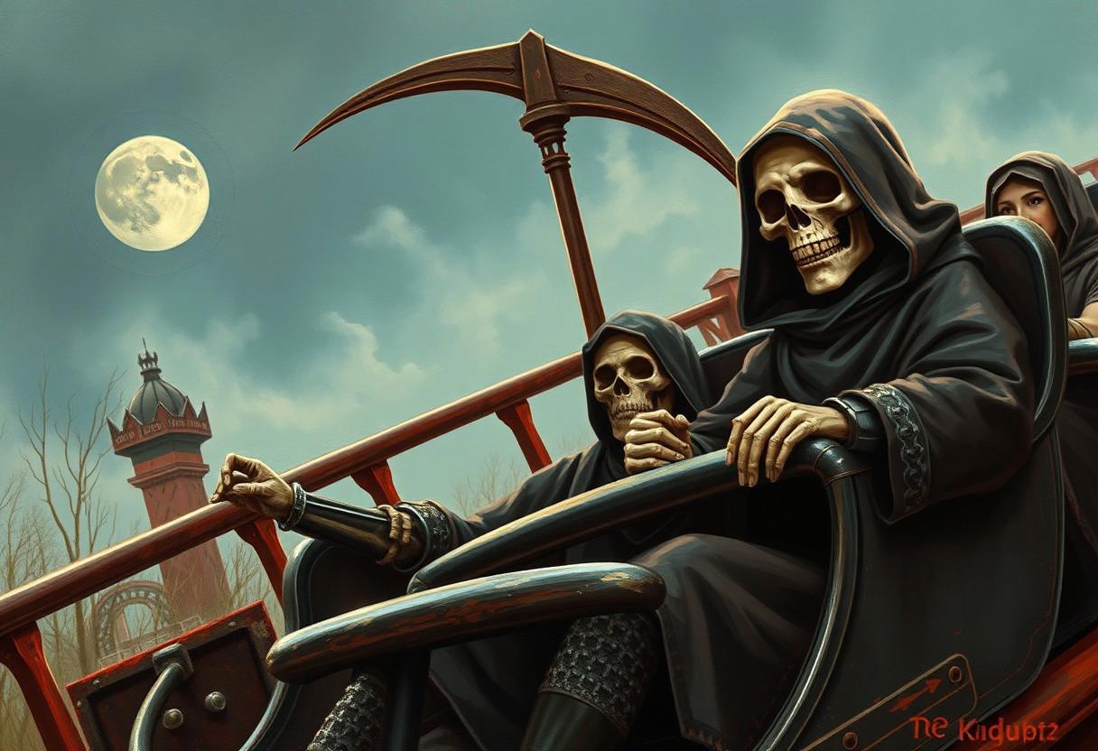 Halloween wallpaper,retro style,#coaster #Death #Easter Eggs #Fantasy #Friends #Fun #Grim Builder #story #history #joy #up #Knight #nightjupp #Middle Ages #Middle Ages #Park #Roller #rollercoaster #Sir jupp #Sir juppofbram #Skeleton #Theme Park #YDL Hint: An old, friendly, skeleton-thin knight in rusty chain mail and a Grim Reaper with a Scythe in a dark hooded robe are sitting next to each other in front of the first carriage on a roller coaster at an amusement park and are clearly having fun. Other normal people, men and women in modern 21st century clothes, are sitting in the black cars of the roller coaster. Modifiers: fantasy oil on canvas, 4k high-detail wallpaper, award-winning, Doctor Death, medieval knight, skeleton, grim reaper