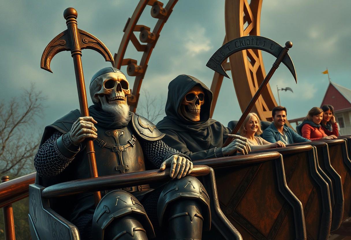 Halloween wallpaper,retro style,#coaster #Death #Easter Eggs #Fantasy #Friends #Fun #Grim Builder #story #history #joy #up #Knight #nightjupp #Middle Ages #Middle Ages #Park #Roller #rollercoaster #Sir jupp #Sir juppofbram #Skeleton #Theme Park #YDL Hint: An old, friendly, skeleton-thin knight in rusty chain mail and a Grim Reaper with a Scythe in a dark hooded robe are sitting next to each other in front of the first carriage on a roller coaster at an amusement park and are clearly having fun. Other normal people, men and women in modern 21st century clothes, are sitting in the black cars of the roller coaster. Modifiers: fantasy oil on canvas, 4k high-detail wallpaper, award-winning, Doctor Death, medieval knight, skeleton, grim reaper