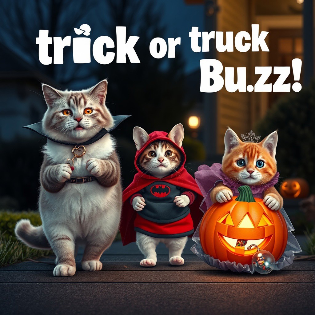 Ultra realistic. white grey brown happy cat with a vampire costume, a small hamster with hero costume, a orange cat on a princess costume carring a carved pumpkin with candies, walking on a suburban street, trick or treating houses, midnight light, on a porch house, yelling "trick or Buzz" text in white letters