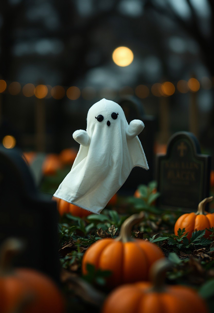 35mm photograph, film, bokeh, professional, in the graveyard sits one adorable cute plushie ghost, floating above ground, in moonlight, pumpkins, hyperrealistic, super realistic, sharp focus, 32k, (((masterpiece))) (((ultimate quality))), exquisite beauty, highiest texture resolution, photorealistic, fantasy setting, epic composition, ral-smlvltnpls, close to viewer,