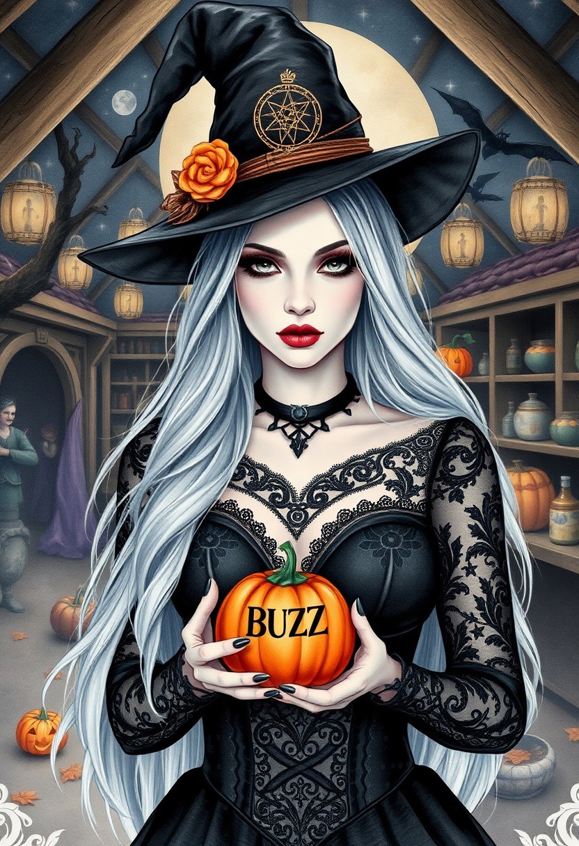 illustration featuring a mystical, Halloween-themed portrait. The layout is centred, focusing on a woman with long, flowing silver hair, wearing a black witch's hat adorned with mystic symbols. Her skin is pale, and she has striking facial features with dark, dramatic makeup. She is dressed in an intricate black lace bustier. In her hands, she holds a small pumpkin shaped cauldron with the text "BUZZ" on it. The background is a fantastic witches workshop, enhancing the magical and ethereal atmosphere of the scene. ArsMJStyle, Watercolor