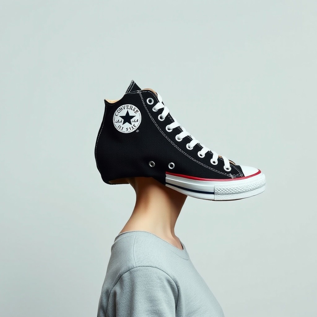 professional photo, detailed photo, profile of woman, she has no head, she has no face her entire head is a sneaker (((black-canvas-women's-Converse-sneaker))),