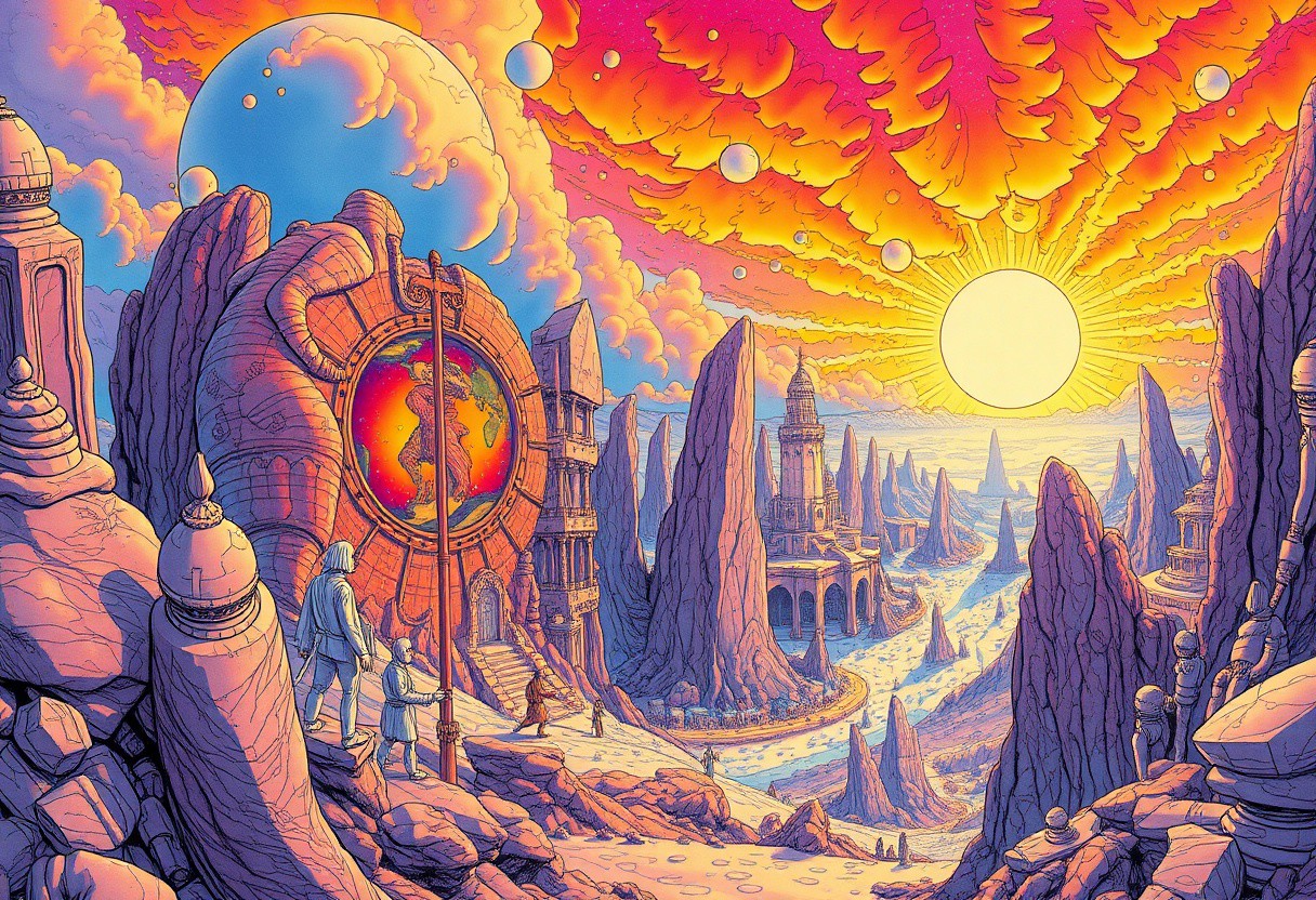 In the unpublished and breathtaking image (far beyond the unseeable) by Moebius, the essence of the Master's artistry shines through with remarkable clarity. As your eyes wander across the canvas, you'll encounter a harmonious fusion of elements that defy convention and ignite the imagination. It is a visual symphony that stands as a testament to Moebius's boundless creativity. Vibrant and sublime colors dominate the image, bursting forth with a luminosity that captivates the viewer.