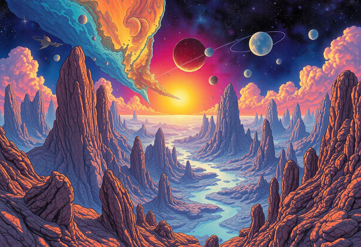 In the unpublished and breathtaking image (far beyond the unseeable) by Moebius, the essence of the Master's artistry shines through with remarkable clarity. As your eyes wander across the canvas, you'll encounter a harmonious fusion of elements that defy convention and ignite the imagination. It is a visual symphony that stands as a testament to Moebius's boundless creativity. Vibrant and sublime colors dominate the image, bursting forth with a luminosity that captivates the viewer.