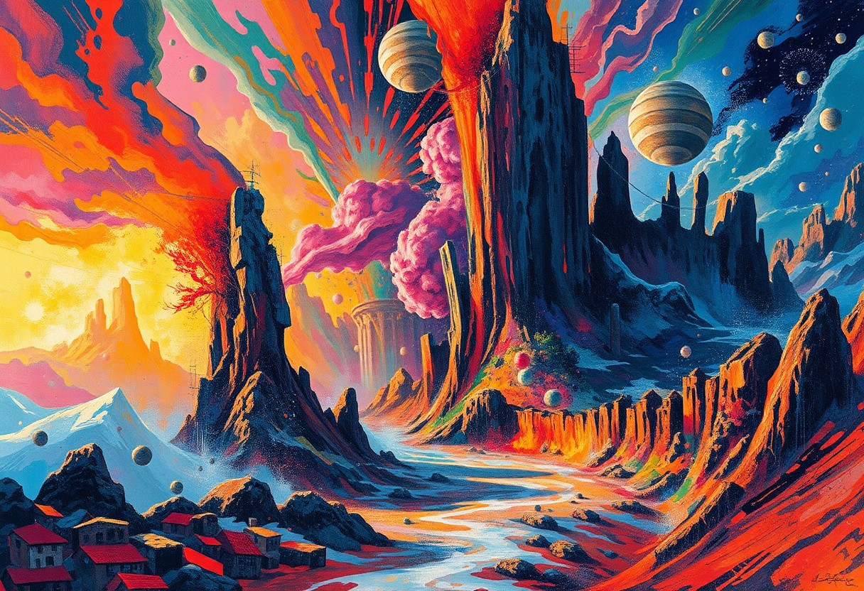 In the unpublished and breathtaking image (far beyond the unseeable) by john berkey, the essence of the Master's artistry shines through with remarkable clarity. As your eyes wander across the canvas, you'll encounter a harmonious fusion of elements that defy convention and ignite the imagination. It is a visual symphony that stands as a testament to Berkey's boundless creativity. Vibrant and sublime colors dominate the image, bursting forth with a luminosity that captivates the viewer.