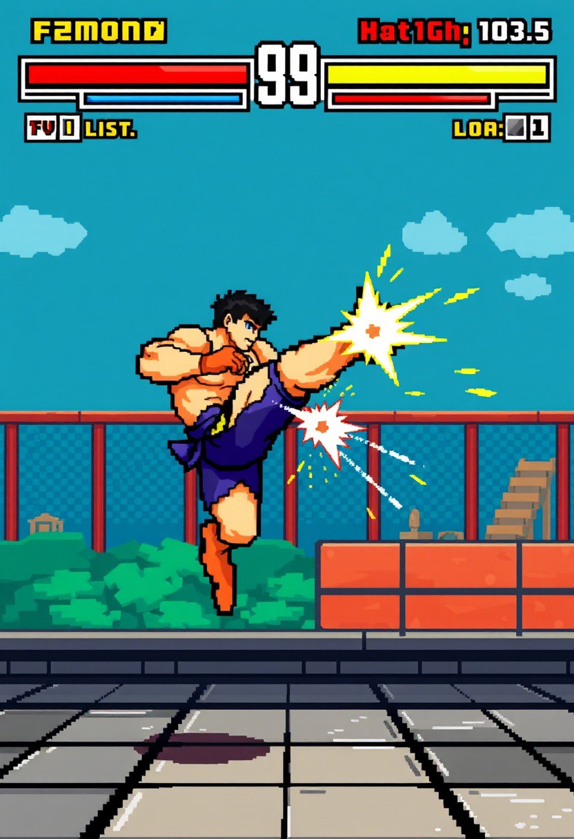 (8-bit pixel art:1.5), (2D fighting game style:1.4), side-scrolling view, (blocky character sprites:1.3), limited color palette, (sharp outlines:1.3), (low-resolution pixels:1.5), (retro game background:1.2), (arcade screen feel), (exaggerated attack animations:1.3), (glitch effects:1.2), (vivid flat colors), (simple shading), (chiptune energy:1.1), (game UI overlay), action pose, (hit spark effects:1.3), (jumping kick frame), (simplified anatomy), (realism:-1.5), (photorealism:-1.5), (natural proportions:-1.3), (smooth textures:-1.2), (detailed rendering:-1.4), (soft edges:-1.3), (blurry effects:-1.3), (floating elements:-1.2), (muted tones:-1.1)