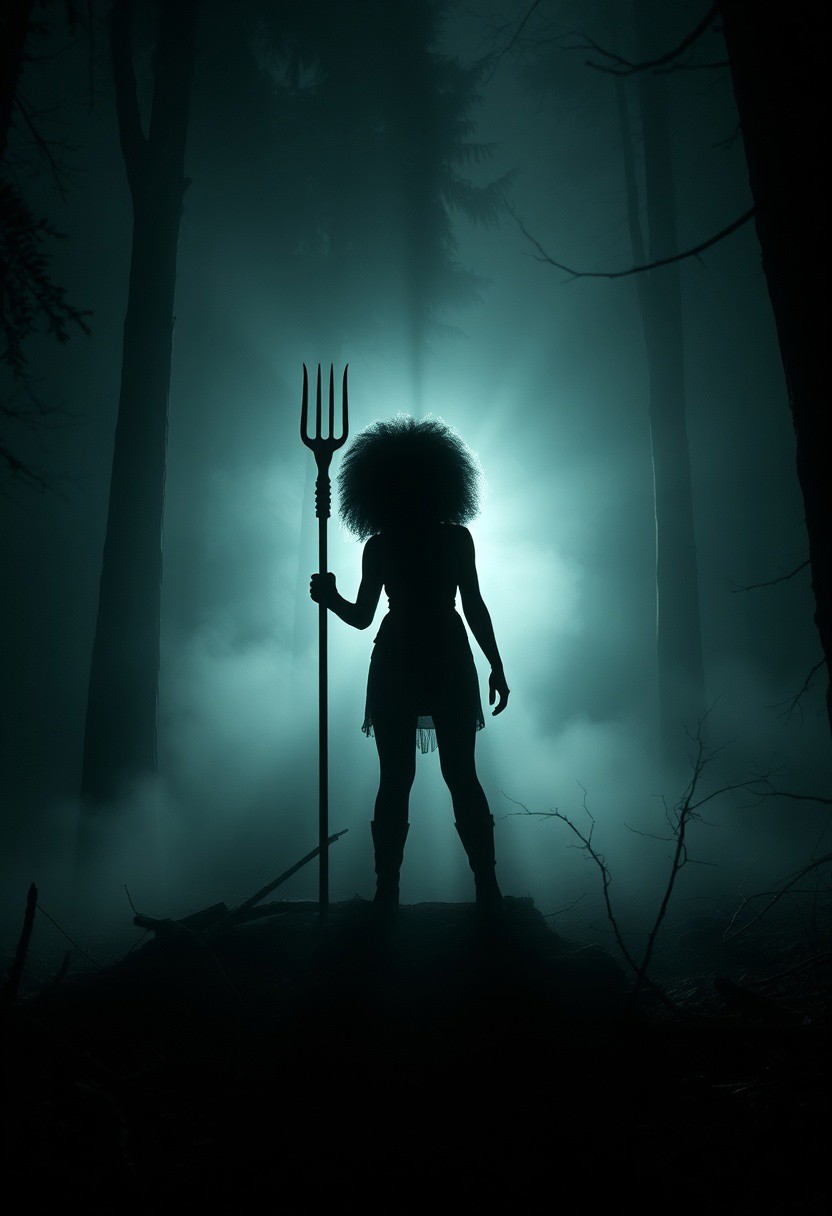 A dark and terrifying scene inspired by classic horror films. Picture a secluded, fog-covered forest at night, with towering trees casting long shadows. In the center of the scene stands a menacing feminine figure with a huge afro, holding a pitchfork in one hand, surrounded by eerie, flickering lights. The figure’s silhouette is partially obscured by mist, creating a sense of dread and anticipation. Broken branches and ominous shapes are scattered across the ground, hinting at a recent struggle. The atmosphere is heavy with tension, fear, and the looming threat of violence, evoking the unsettling mood of iconic slasher films.