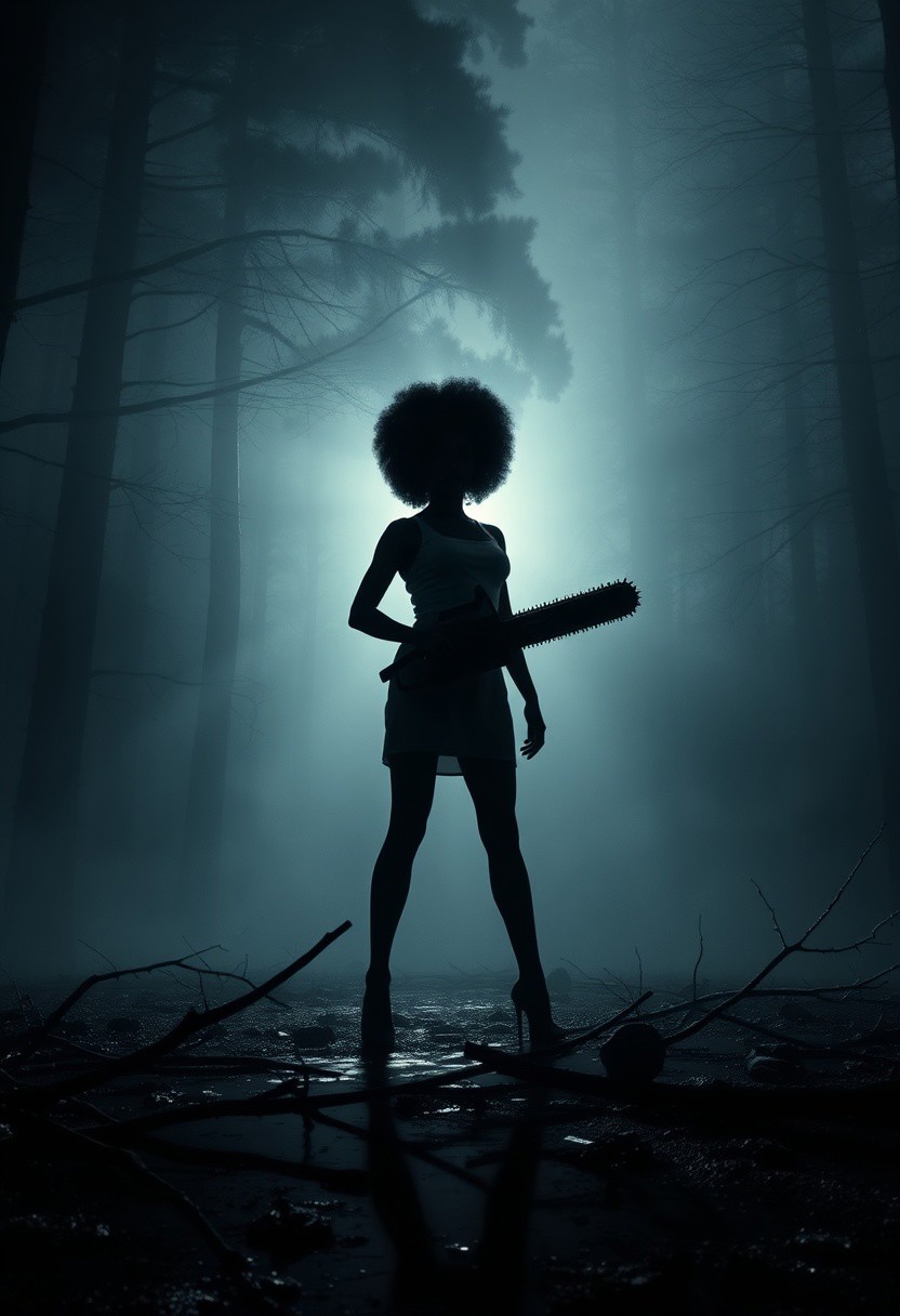A dark and terrifying scene inspired by classic horror films. Picture a secluded, fog-covered lake in the woods at night, with towering trees casting long shadows. In the center of the scene stands a menacing feminine figure with a afro up-doo, holding a buzzsaw in one hand, surrounded by eerie, flickering lights. The figure’s silhouette is partially obscured by mist, creating a sense of dread and anticipation. Broken branches and ominous shapes are scattered across the ground, hinting at a recent struggle. The atmosphere is heavy with tension, fear, and the looming threat of violence, evoking the unsettling mood of iconic slasher films.