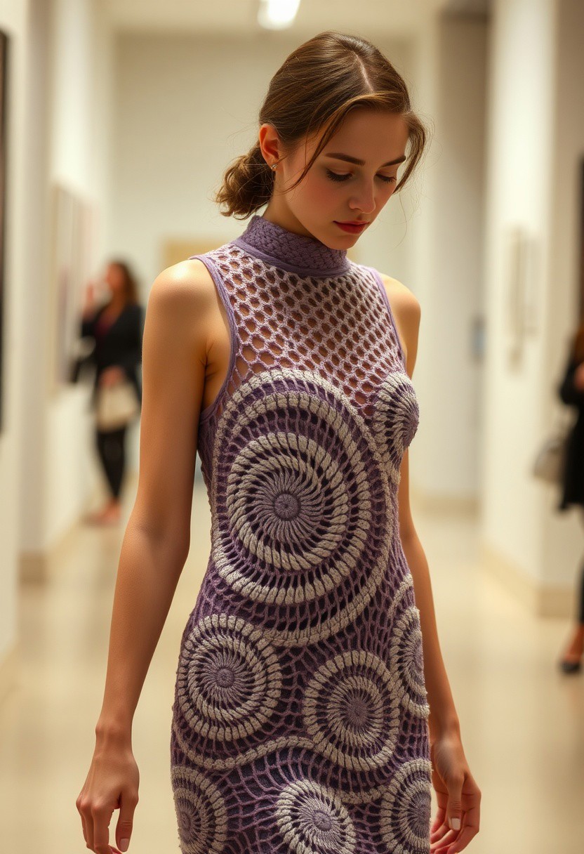 (nubile young woman:1.3), wearing (dress knitted from a single large spirograph pattern:1.6), (intricate spiral knitting:1.4), (dense pattern at core:1.5), (lighter, semi-revealing spirals along edges:1.3), (elegant interplay of skin and fabric), (symmetrical design:1.2), (soft curves in knitted structure), (subtle color gradient through spirals:1.2), (light wind gently moving fabric), (glowing thread highlights:1.1), (graceful, modest design), (urban background or gallery setting), (minimal accessories), (photorealism:-1.4), (mutated anatomy:-1.3), (blurry edges:-1.3), (flat textures:-1.2), (oversaturated colors:-1.2), (bulky fabric:-1.4)