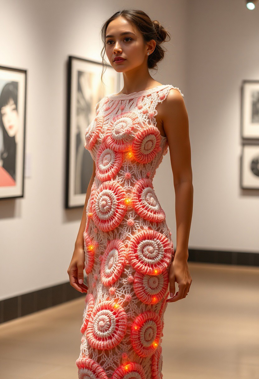 (nubile young woman:1.3), wearing (dress entirely made of knitted spirograph shapes:1.6), (interwoven geometric spirals:1.5), (structural spiral knitting:1.4), (dynamic curves in fabric structure), (delicate spiral patterns forming the dress silhouette:1.3), (soft fabric flow despite intricate structure:1.2), (light and shadow play across spiral knitting:1.2), (vivid gradients along knitted curves), (organic yet symmetrical design:1.3), (soft glowing edges on fabric), (slight movement effect on spirals), (minimal accessories), (elegant, confident pose), (urban art gallery background:1.1), (realism:-1.5), (photorealism:-1.5), (blurry details:-1.3), (flat textures:-1.2), (mutated anatomy:-1.3), (oversaturated lighting:-1.2)
