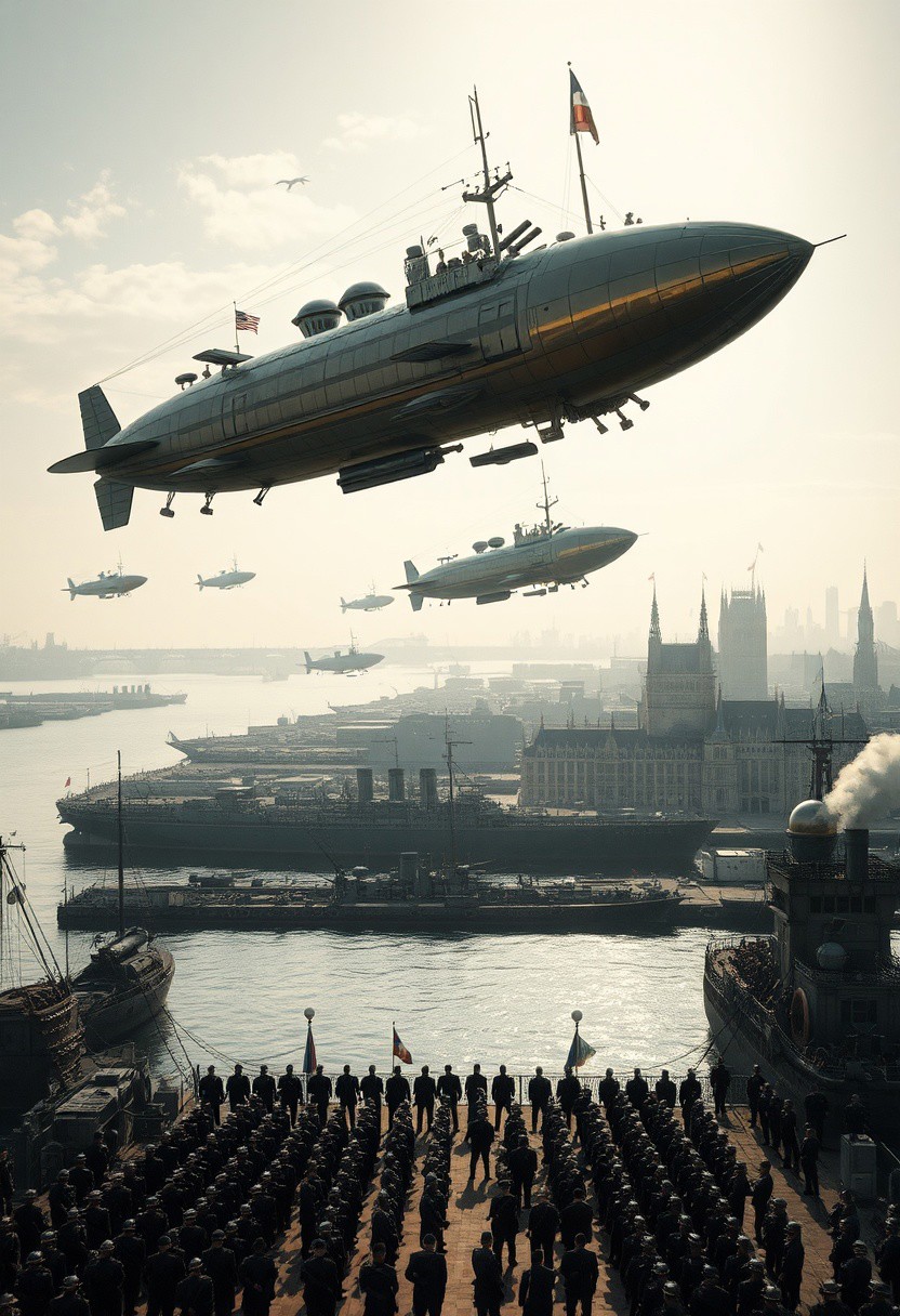 Top pov, high angle shot, bird eyes view, (Ultra-realistic, 32k, Masterpiece, High Quality, Detailed Realistic Background, Official Art, Realistic Lighting, filmfotos, film grain, reversal film photography). In the expansive harbor, a fleet of Victorian steampunk airships soars through the sky, their bronze and iron hulls glistening in the diffused morning light. Gears and propellers churn rhythmically, while steam hisses from the vents, propelling the airships toward the distant horizon. Below, the ground is a hive of activity, where an army clad in polished iron armor stands at attention, awaiting orders. The soldiers, positioned in precise formations, prepare to board the massive battleships docked along the pier. The navy's imposing vessels, crafted with industrial-era ingenuity, are lined up, chimneys spewing thick plumes of smoke into the sky. A sense of anticipation permeates the air as the forces ready for battle. The city behind them, with its towering gothic architecture, casts long shadows across the harbor, adding to the tension. The dramatic, low-angle shot captures the converging forces of air and sea, amplifying the chaos and strategic intensity of the moment. The sky darkens as storm clouds gather, setting an epic and moody cinematic tone.