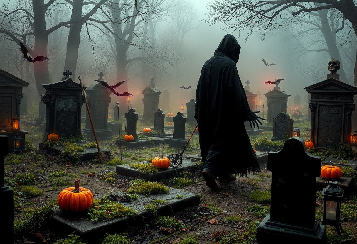 ultra realism, ultra image quality instilling an atmosphere of horror, mystery and excitement. It is as if we have entered the world of the dead. In the cemetery, located at the edge of the city, Death wanders among the graves, wrapped in a black mantle. behind him walks a dead soul tied on a magical leash. The graves are covered with moss and cobwebs, and the tombstones are inscribed with ancient runes. A fog hovers around the graves, adding to the eerie feeling. Ghostly figures appear and disappear among the graves, watching from the shadows. Colors: Orange, black, purple, navy blue, green. Objects: Pumpkins, brooms, bats, cobwebs, cauldrons, skeletons, grills, motorcycles, lanterns, graves, coffins, skulls and bones, Gothic style. Emotions: Horror, fear. Atmosphere: Dark, mysterious, exciting, as if we are in the world of the dead. Styles: realistic, gothic, rock metal style. Additional elements: Fog that covers the streets, enhancing the eerie feeling; old, creaky wooden signs with ghostly inscriptions; flickering candle lights in the pumpkins casting dancing shadows; and ghostly figures appearing in the distance watching from the shadows.