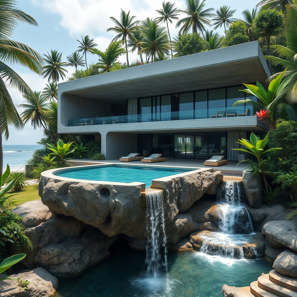 A futuristic concrete brutalist modern house with swimingpool on a waterfall inspired from a famous architect, with exotic luxuriant vegetation around, in a tropical jungle setting, near a beach, photorealistic, a masterpiece, 4K, high details, view from close, wide lenses camera