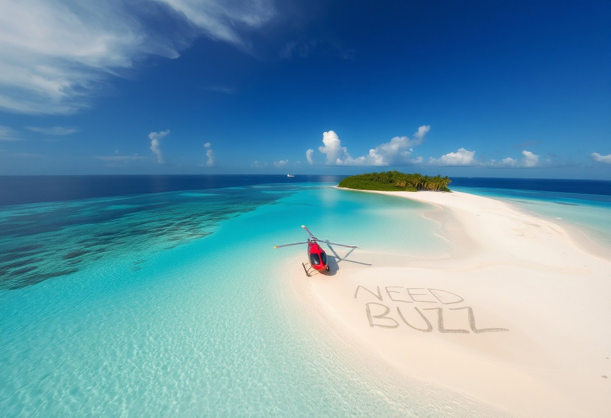 Helicopter aerial view of tropical desert island beach where there is written text on sand by a survivor "NEED BUZZ"