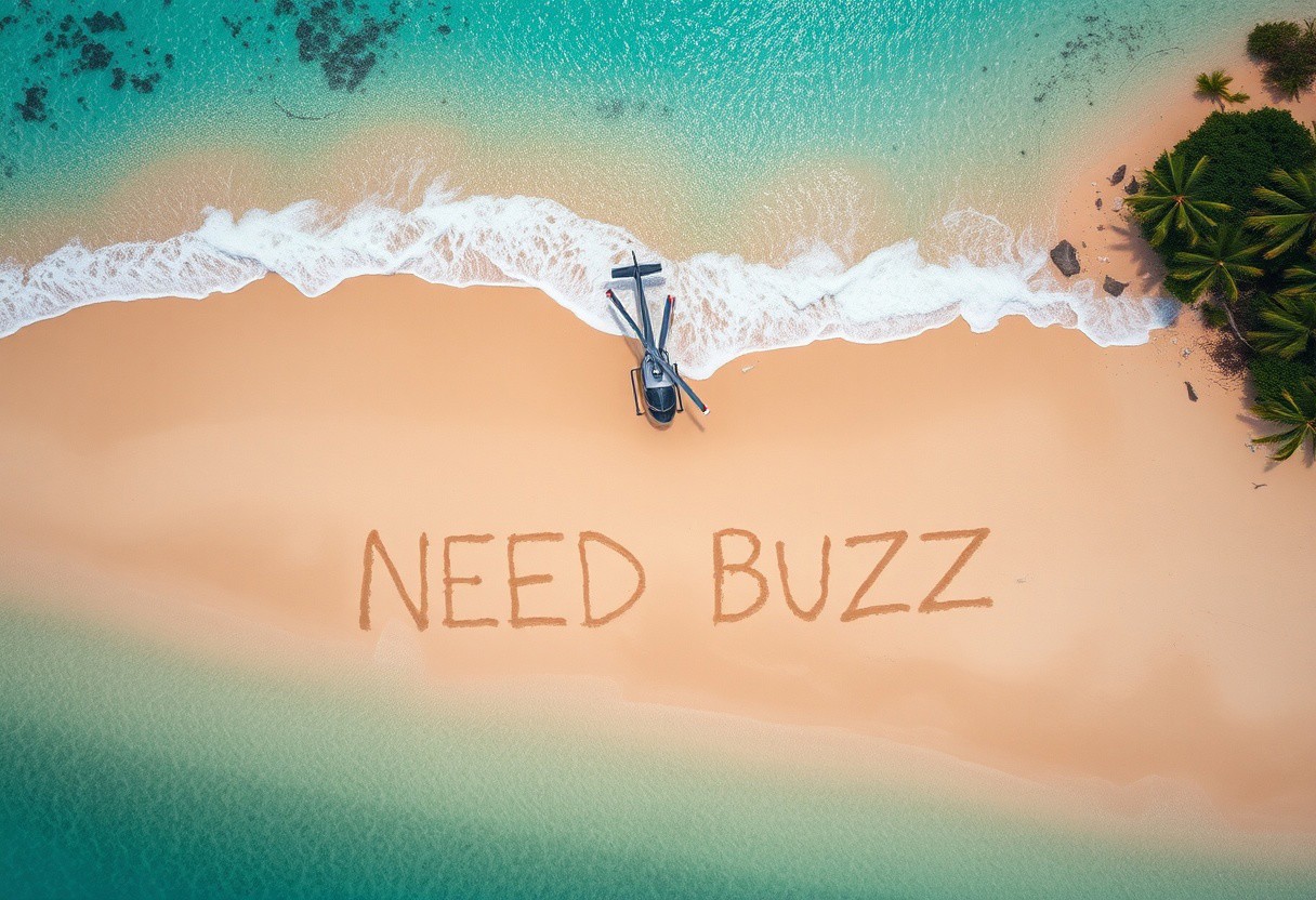 Helicopter aerial view of tropical desert island beach where there is written text on sand by a survivor "NEED BUZZ"