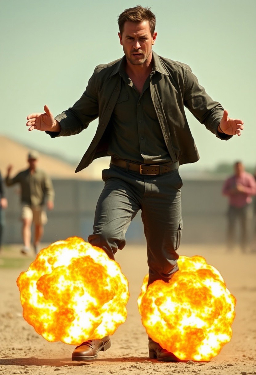 A movie still of a man with exploding knees. There's an explosion in each of his knees. High quality image from an action movie.
