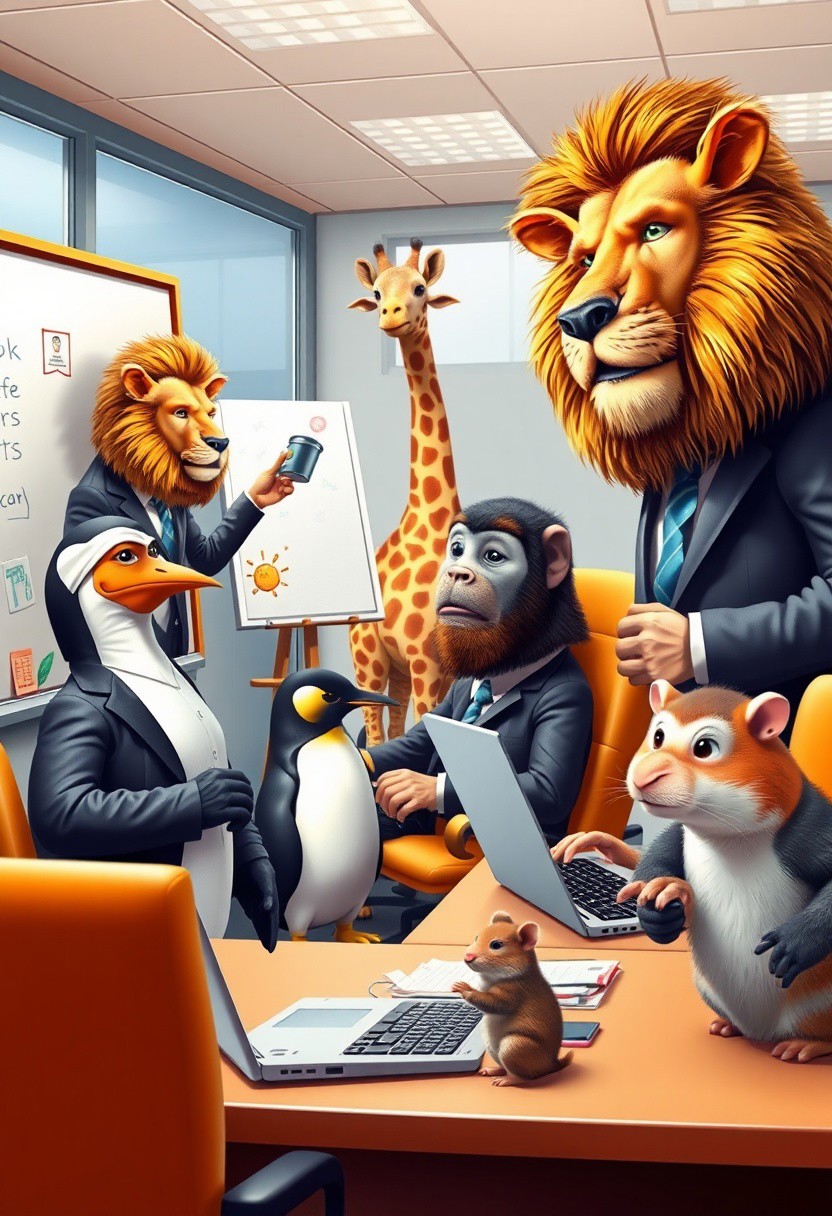 Create a vibrant and funny scene in a busy office where all the workers are replaced by animals in business suits. A serious-looking lion is giving a presentation at the whiteboard, while a clumsy penguin is spilling coffee on the desk, and a monkey is typing furiously on a laptop. In the background, a giraffe is struggling to use the water cooler because it's too tall, and a tiny hamster is trying to use a huge swivel chair, but it keeps spinning. Bright colors, playful expressions, and exaggerated comedic movements.